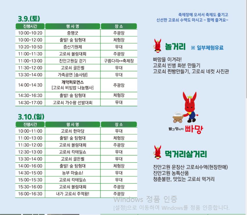 - 고로쇠 한마당, 가수왕 선발대회, 가족공연, 볼링대회, 골든벨 등 볼거리와 체험행사를 즐기실 수 있으며 자세한 일정은 아래 사진을 참고하시기 바랍니다.